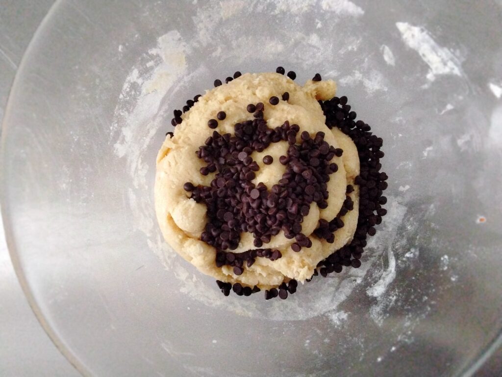 Quando l’impasto inizia a compattarsi, aggiungere le gocce di cioccolato e la scorza di limone grattugiata