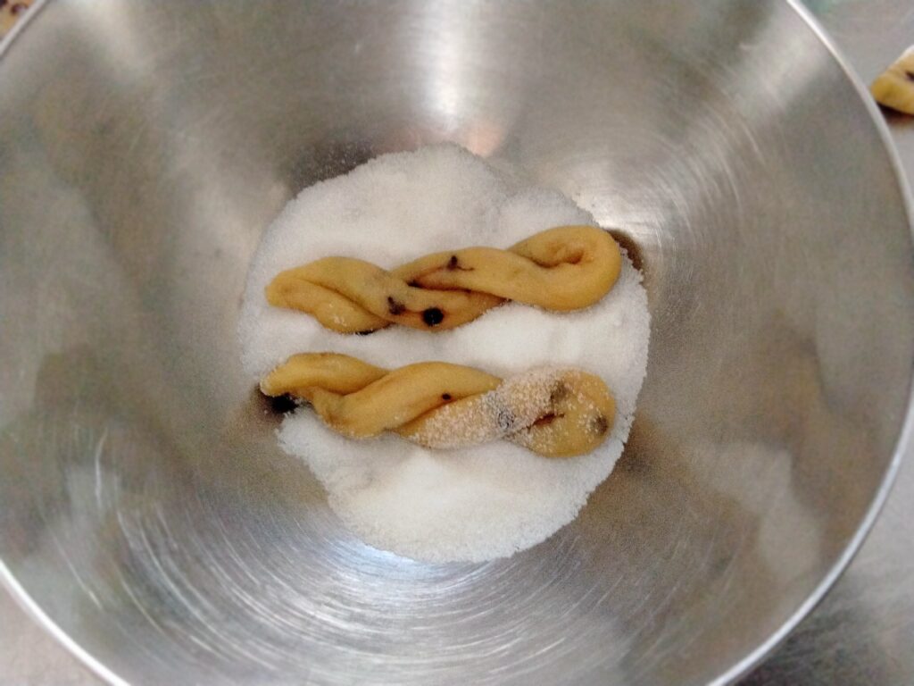 Passare le treccine nello zucchero semolato per ottenere una superficie croccante e leggermente caramellata in cottura.