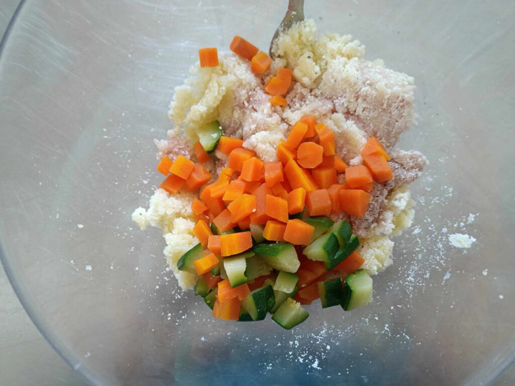 4. Unite alle patate bollite il macinato di pollo , le carote e le zucchine tagliate , il formaggio grattugiato, sale e pepe.