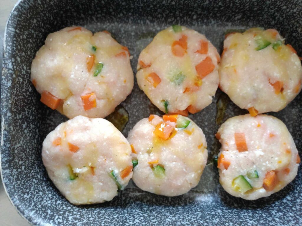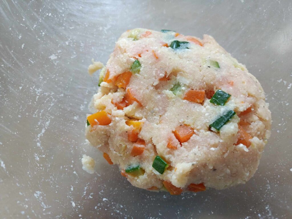 6. Dividete il composto in 7 parti e realizzate delle polpette schiacciate.
