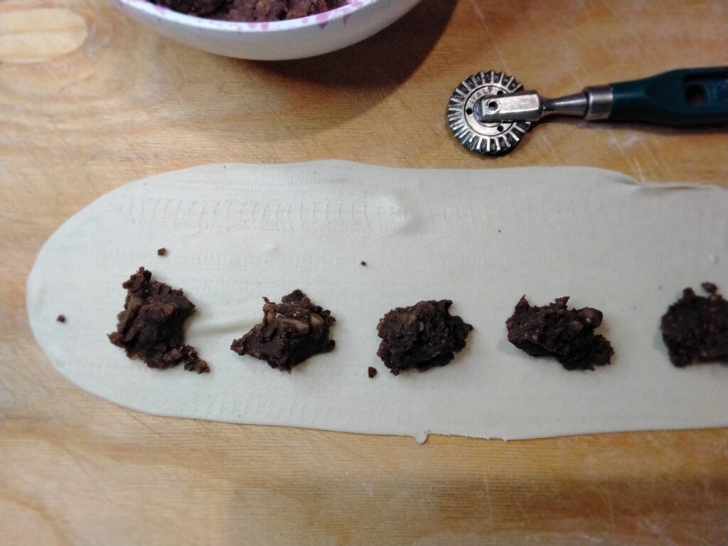 Con l’aiuto di una rotella taglia pasta dentellata , ricavare delle  mezzelune o dei ravioli , premere bene i bordi.