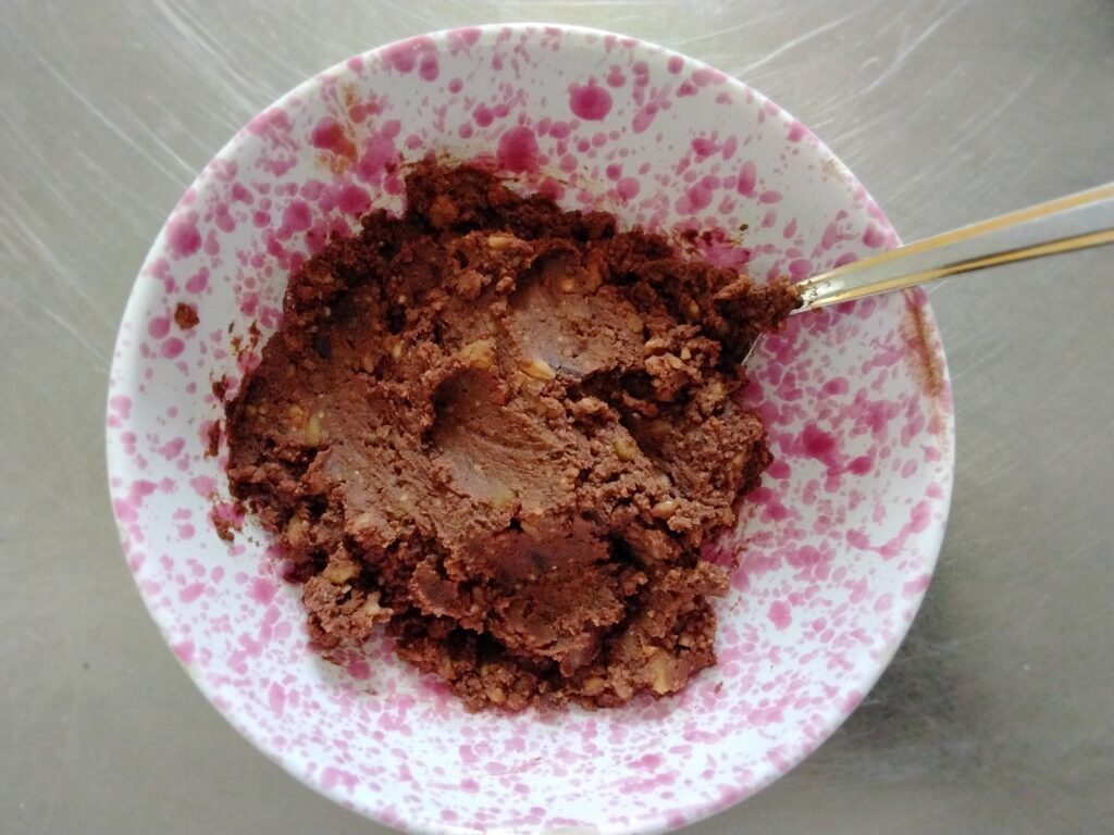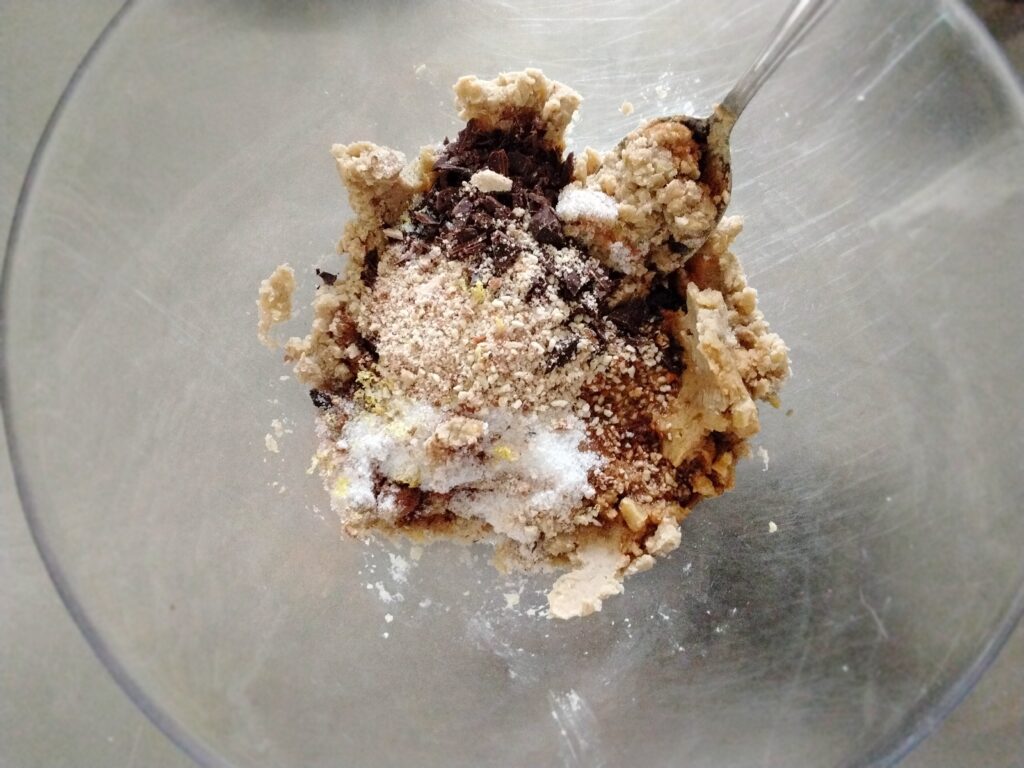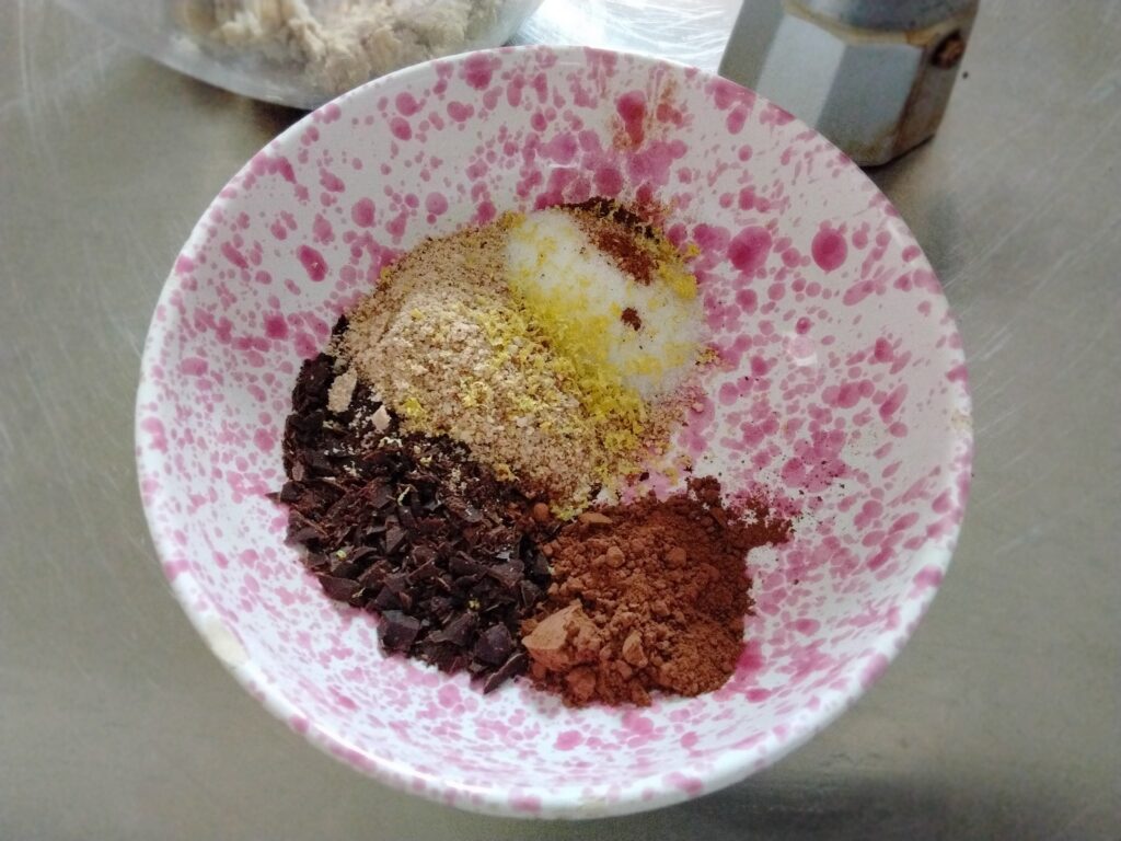 Unire poi il cioccolato e le mandorle tritate, il cacao amaro e il caffe nella quantità necessaria ad amalgamare  bene il tutto.