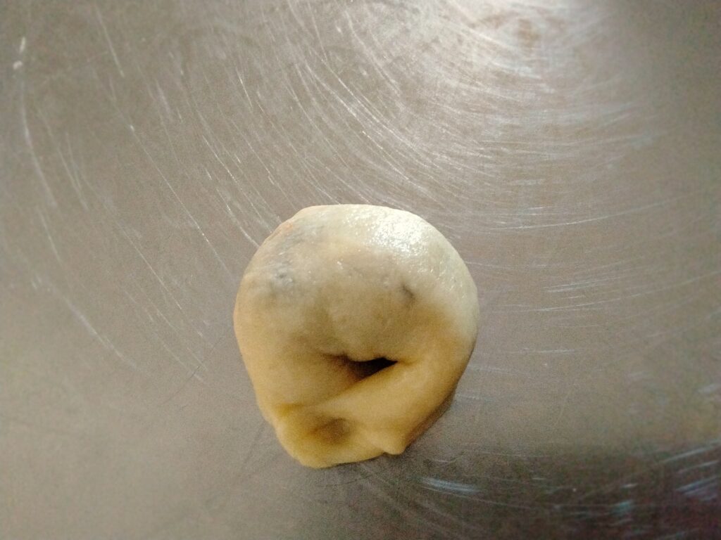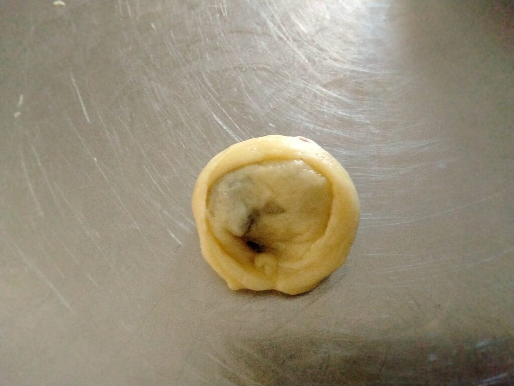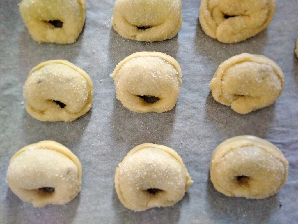 L’impasto morbido e facilmente lavorabile, viene sigillato a dorma di tortellino e infine cotto in forno. Il risultato sarà un biscotto friabilissimo che renderemo ancora pii goloso con l’aggiunta di zucchero sulla superficie.