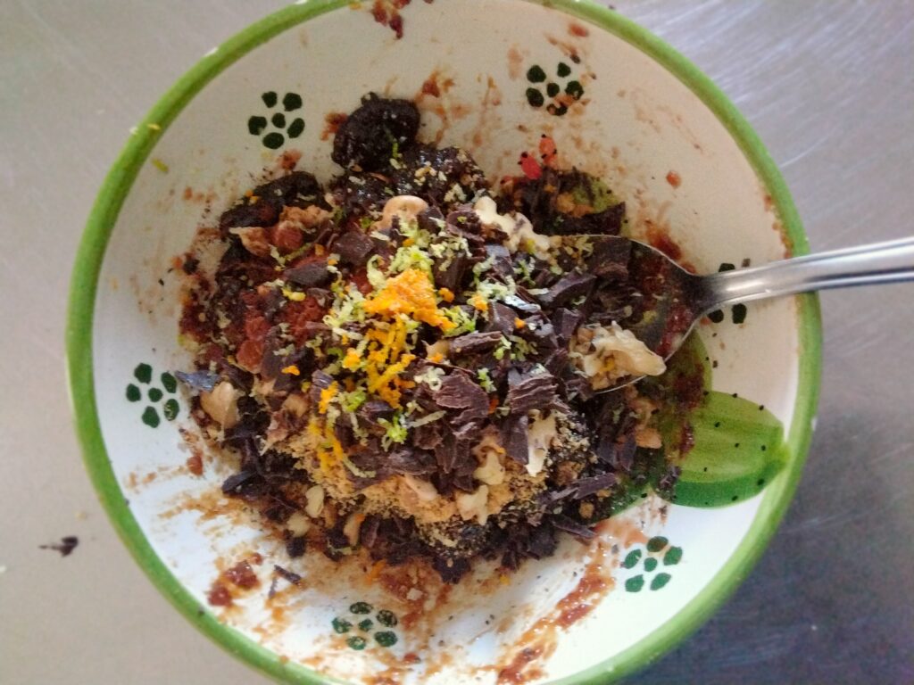 Unire mandorle e /o le noci, cacao, cioccolato, scorza di limone d’arancia , i biscotti o gli amaretti sbriciolati e la cannella.