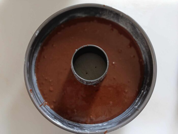 7. Cuocete la ciambella a 180° statico per circa 40 minuti o a 170° ventilato per lo stesso tempo .