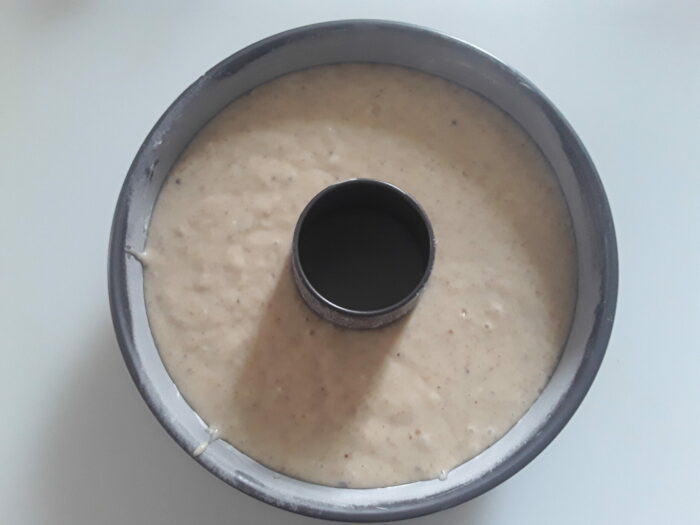 7. Trasferite il tutto in uno stampo da ciambella ( o in una tortiera) precedentemente imburrata e infarinata.