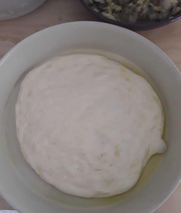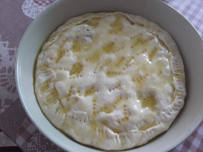 18– quando l’impasto sarà raddoppiato ( il mio dopo 3 ore circa) con le mani unte stendete la massa che avete messo nella teglia.