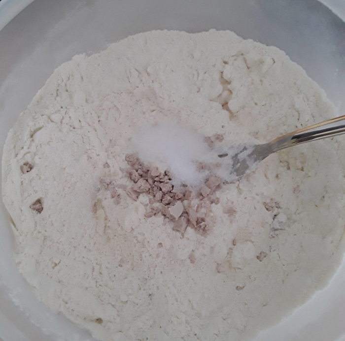 9– in una ciotola unite le due farine ,aggiungete il sale e fate una fontana al centro dove sbriciolare il lievito.