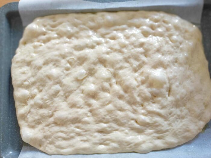 5. Una volta lievitato,  sgonfiate l’impasto e trasferitelo nella teglia oleata cercando di distribuirlo su tutta la superficie.