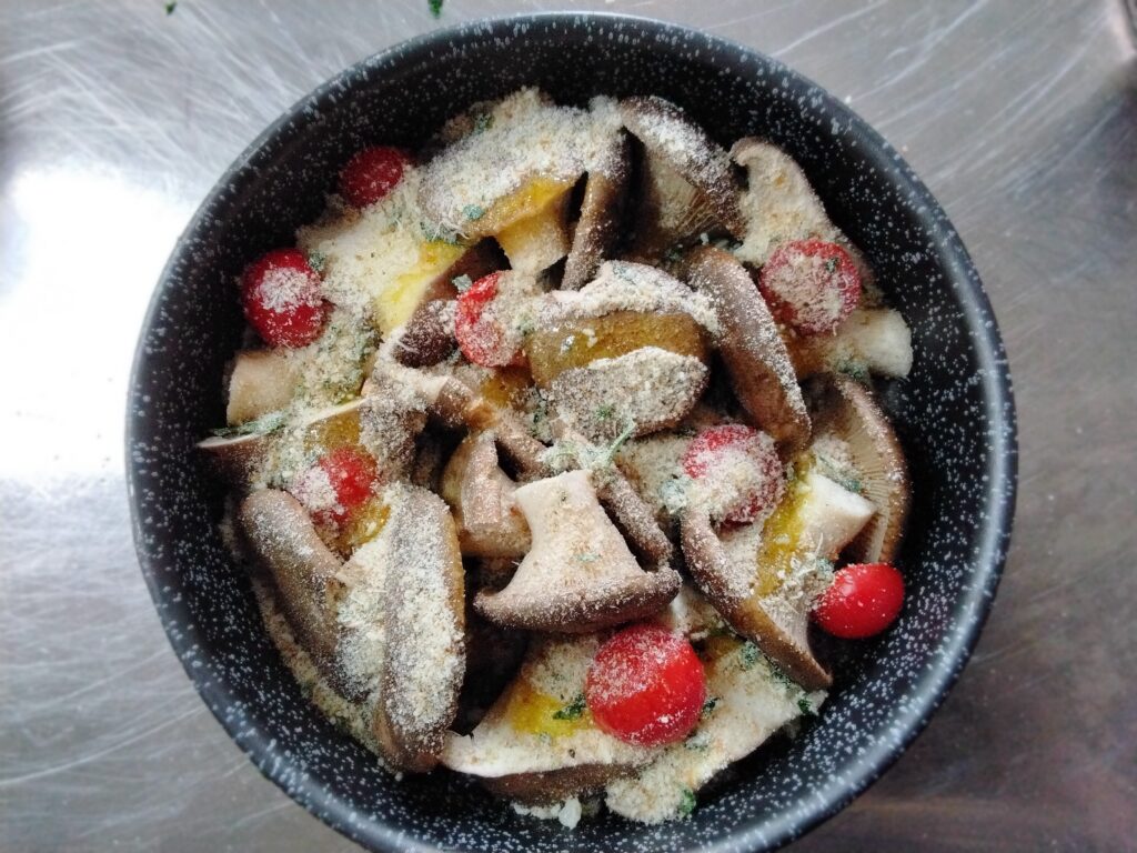 Mescola bene fino a ottenere una consistenza sabbiosa ma leggermente umida, che aderirà facilmente ai funghi.