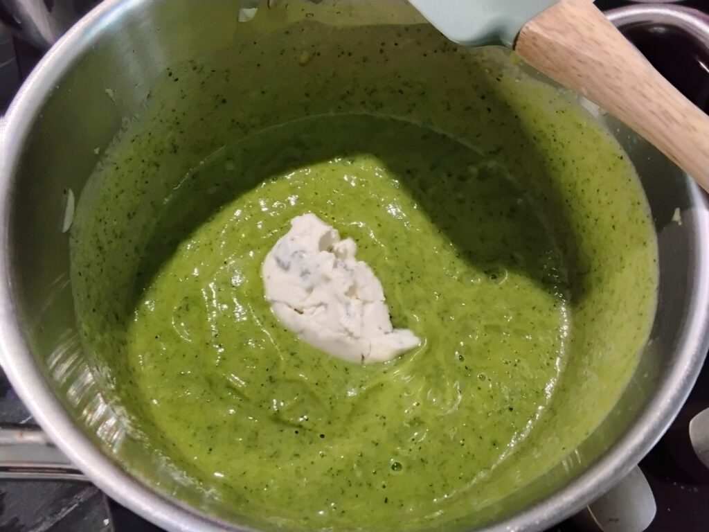 versate la crema di zucchine di nuovo nella padella e aggiungete il gorgonzola tagliato a pezzetti.