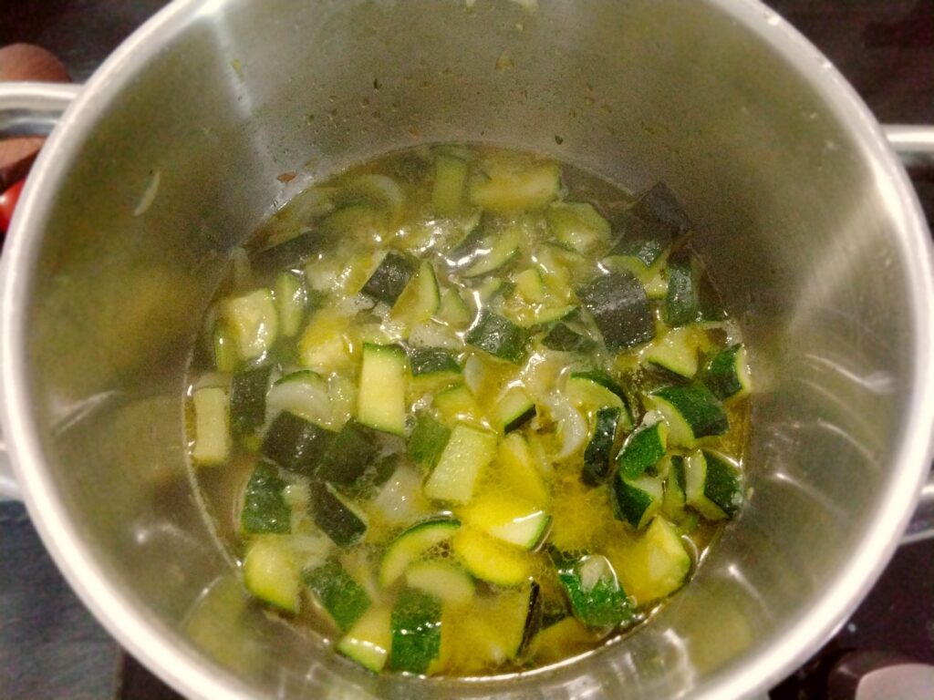 Cuocete a fuoco medio per circa 10-15 minuti, finché le zucchine non saranno morbide aggiungendo dell’acqua a coprire .