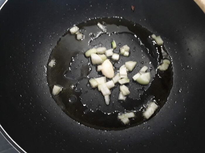 1– In una padella rosolare delicatamente l’aglio e la cipolla in 5 o 6 cucchiai abbondanti di olio,