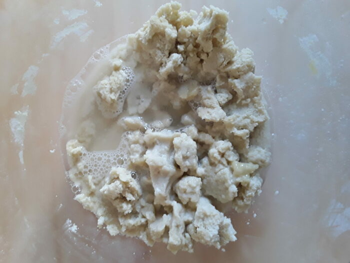 ora poco alla volta aggiungiamo il vino bianco caldo ed impastiamo il tutto fino ad ottenere un composto liscio