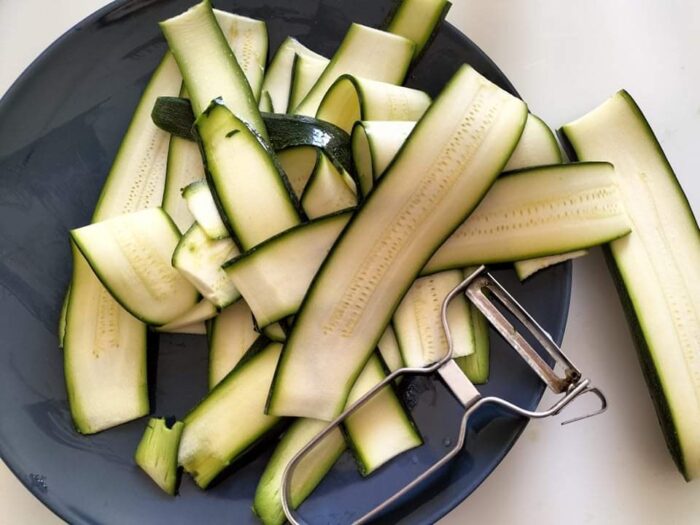 2. Con l’aiuto di un pelapatate o di una mandolina tagliate le zucchine sottili ( circa 3/4 mm).
