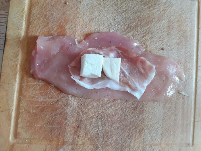 2– adagiamo al centro una fetta di speck e un tocchetto di mozzarella.