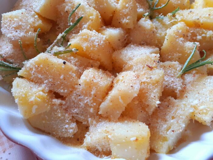4– tagliamo a tocchetti le patate bollite e le cospargiamo con 1 cucchiaio di formaggio grattugiato e uno di pangrattato.