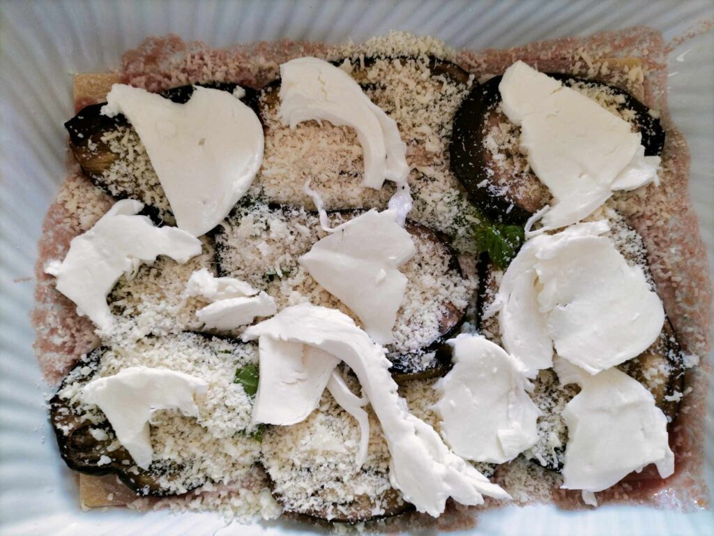 7. Terminate con melanzane sminuzzate o a fette , mozzarella fior di latte , abbondante parmigiano e passata di pomodoro a ricoprire il tutto.