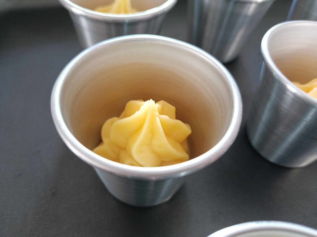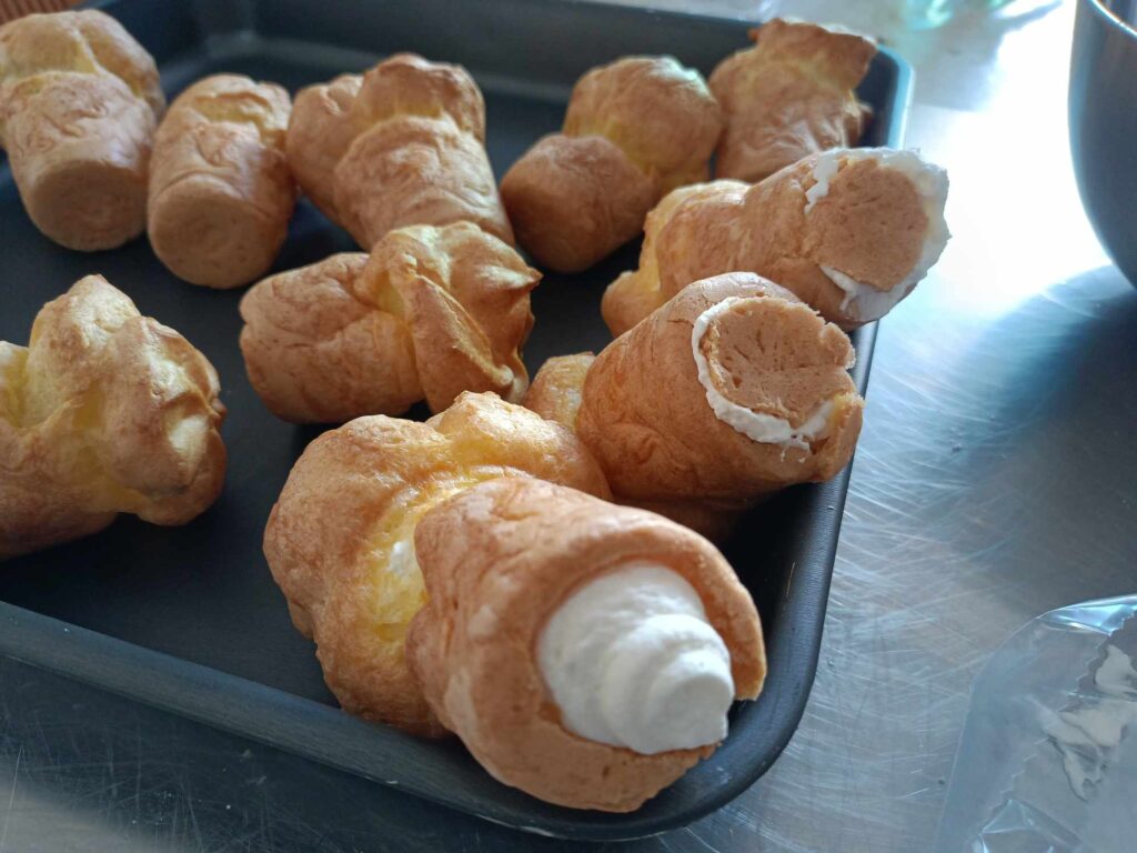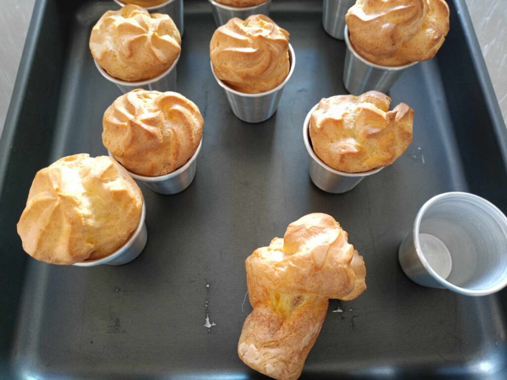 L’impasto ottenuto va inserito negli stampini da babà ( quelli piccoli a forma di bicchierino) , cotto in forno e quindi farcito.