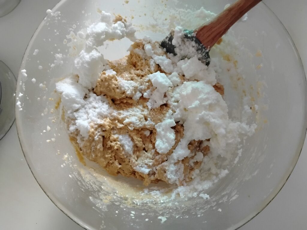 8. Incorpora, per ultimi, gli albumi montati a neve ferma , avendo cura di mescolare dal basso verso l’alto in modo da non smontare il composto.