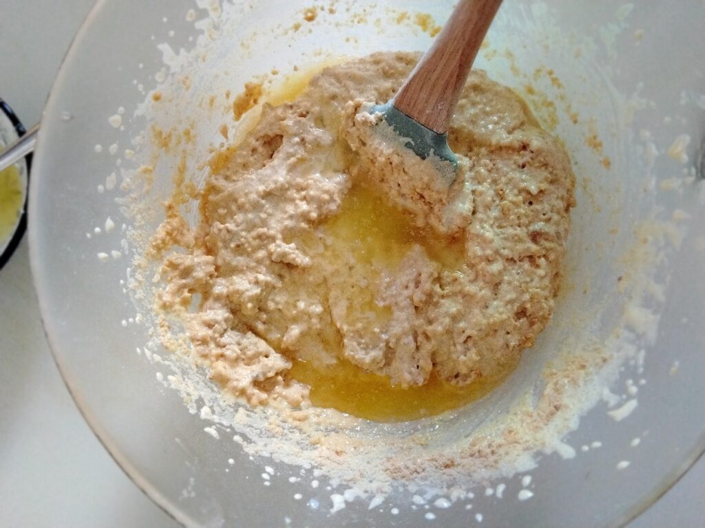 7. Aggiungi il burro fuso freddo in 3 volte , mescolando sempre con delicatezza dal basso verso l’alto.