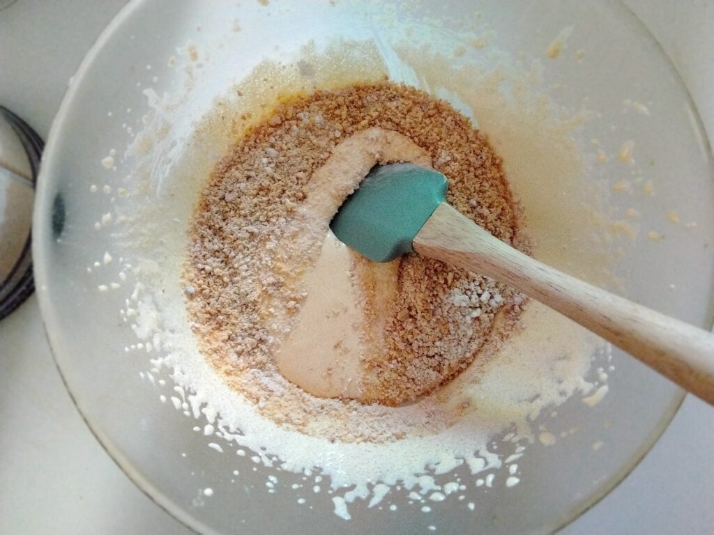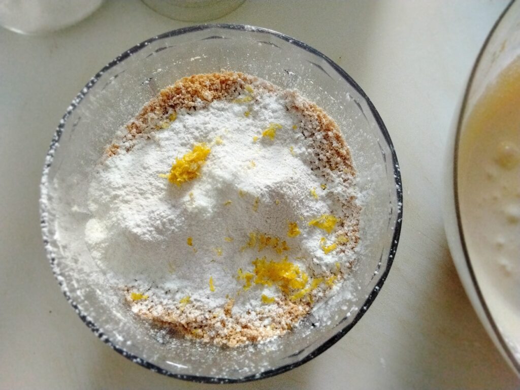 4. Mescola le mandorle tostate tritate con la farina di mandorle ( o l’amido di mais ) e il lievito setacciati.