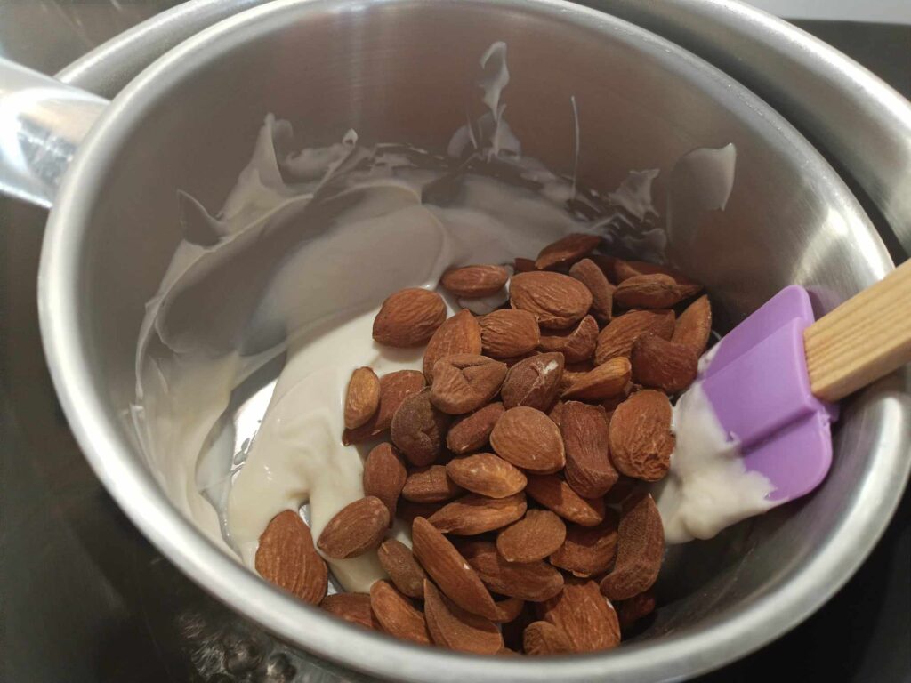 3. Unite le mandorle tostate al cioccolato e mescolate con cura.