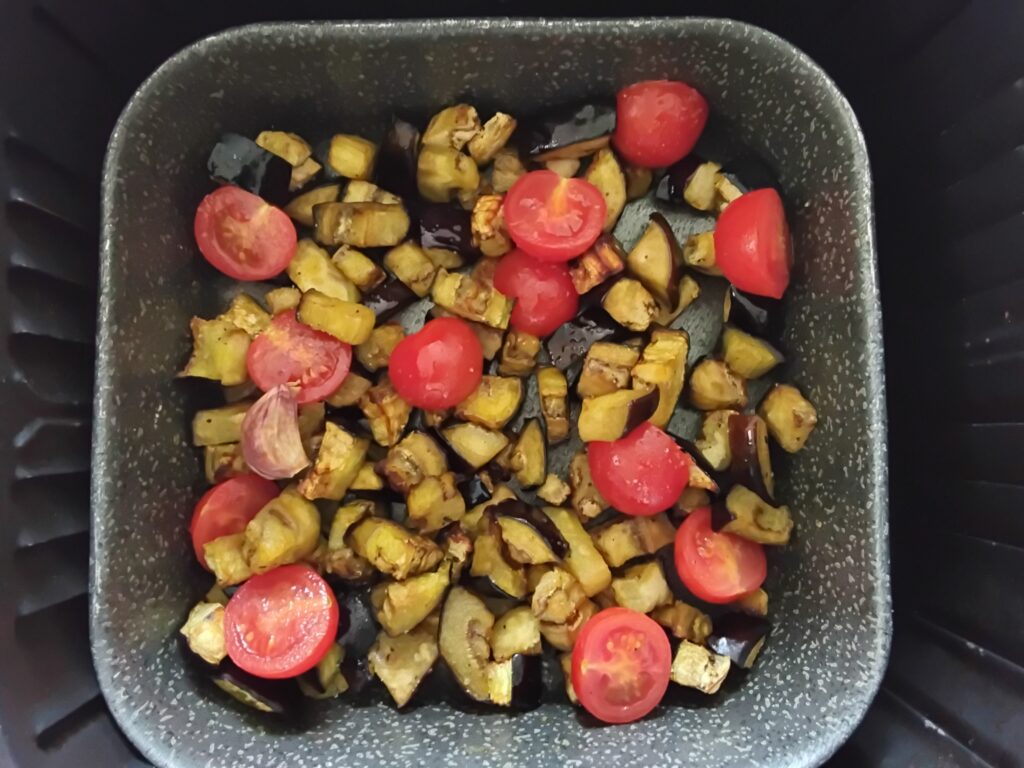 Condisci i cubetti di melanzana con un filo d’olio e un pizzico di sale, mescolando bene. Mettili nel cestello della friggitrice ad aria in un solo strato (se necessario, cuoci in due volte).