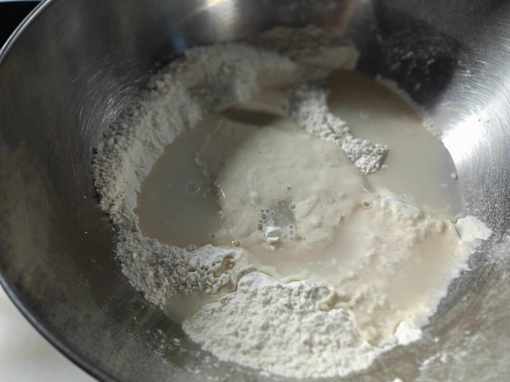 2– Versate la farina ( l il mix di farine) in una ciotola, con un cucchiaio fate un buco al centro e unite l’acqua nella quale avete sciolto il lievito e il miele ( o lo zucchero o il malto) .