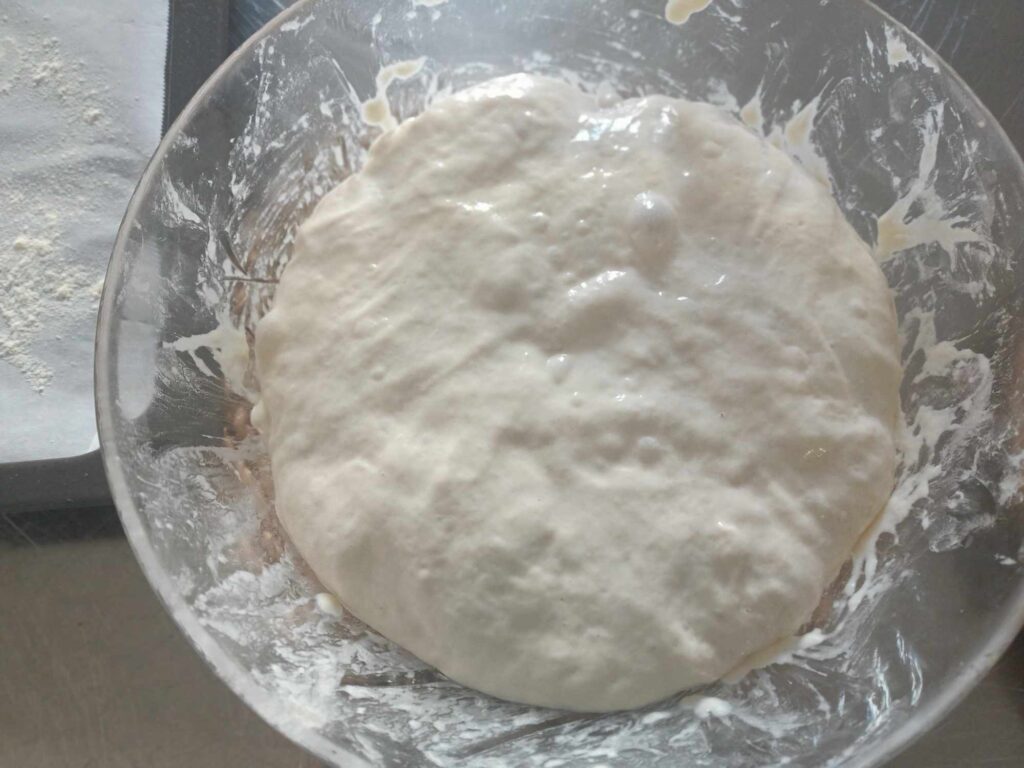A questo punto potete lasciare lievitare fino a raddoppio o procedere con altri 2 giri di pieghe ogni 30 minuti.