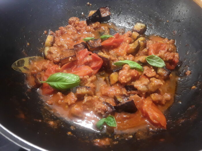 5. A fine cottura unite la melanzana fritta e il basilico  , mescolate e spegnete il fuoco.