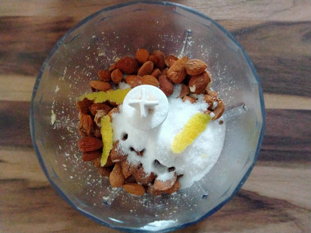 Frulla le mandorle con lo zucchero e la scorza di arancia o limone.