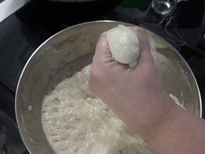 6. Aggiungete l’olio extravergine di oliva e impastate schiaffeggiando l’impasto per almeno 10 minuti