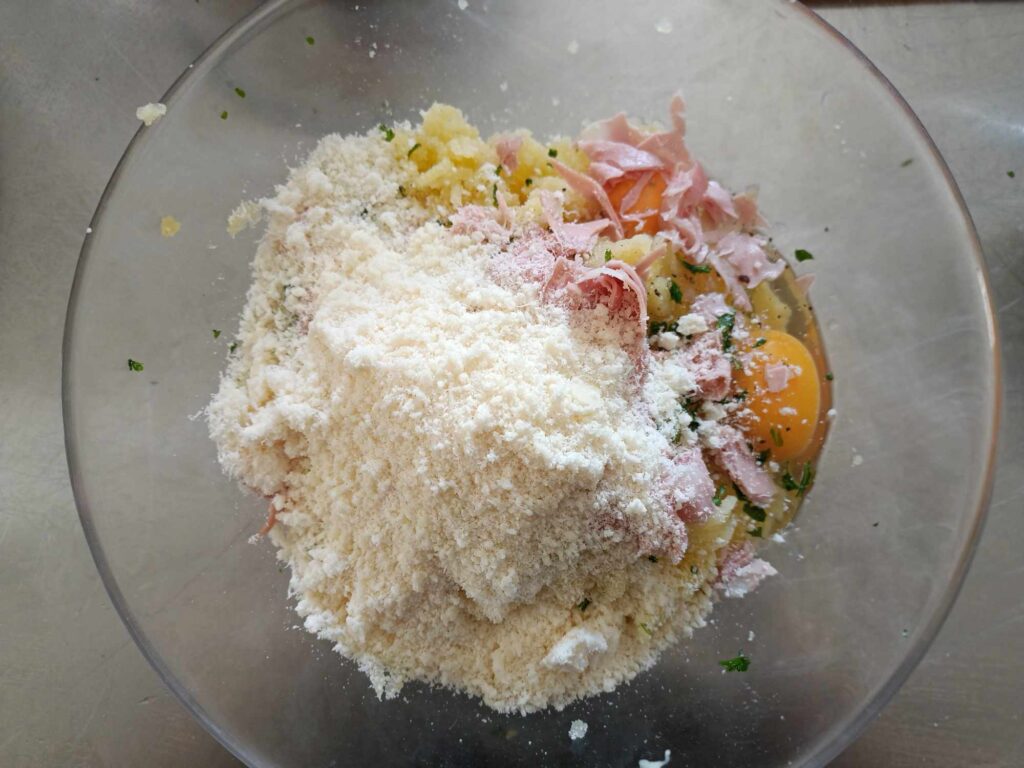3.  Condite le patate con sale e pepe,  prezzemolo tritato ( nonna Maria aggiungeva anche una puntina di aglio) , mortadella sminuzzata, uova e formaggio.