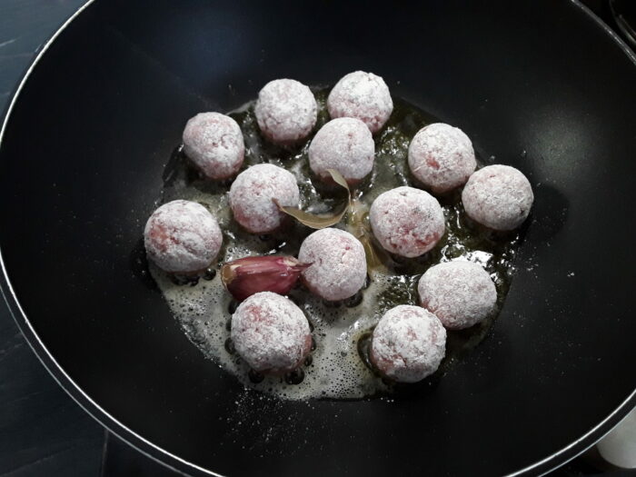 7. Eliminate l’eccesso di farina e rosolate le polpette a fuoco vivace.