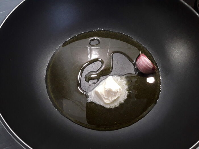 5. In una padella antiaderente mettete un filo d’olio extravergine di oliva e una noce di burro e rosolate uno spicchio d’aglio in camicia.