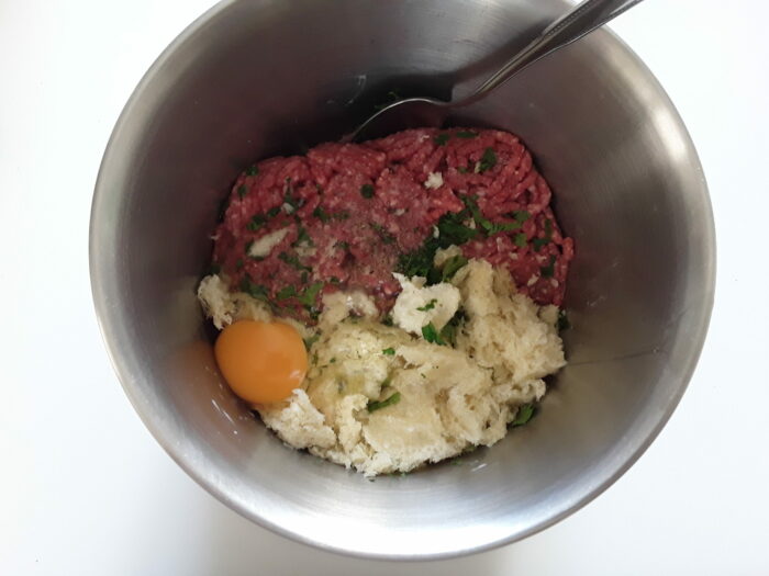 1. In una ciotola mettete in ammollo il pane col latte , dopo qualche minuto unite la carne macinata, il sale e il pepe e l’uovo;