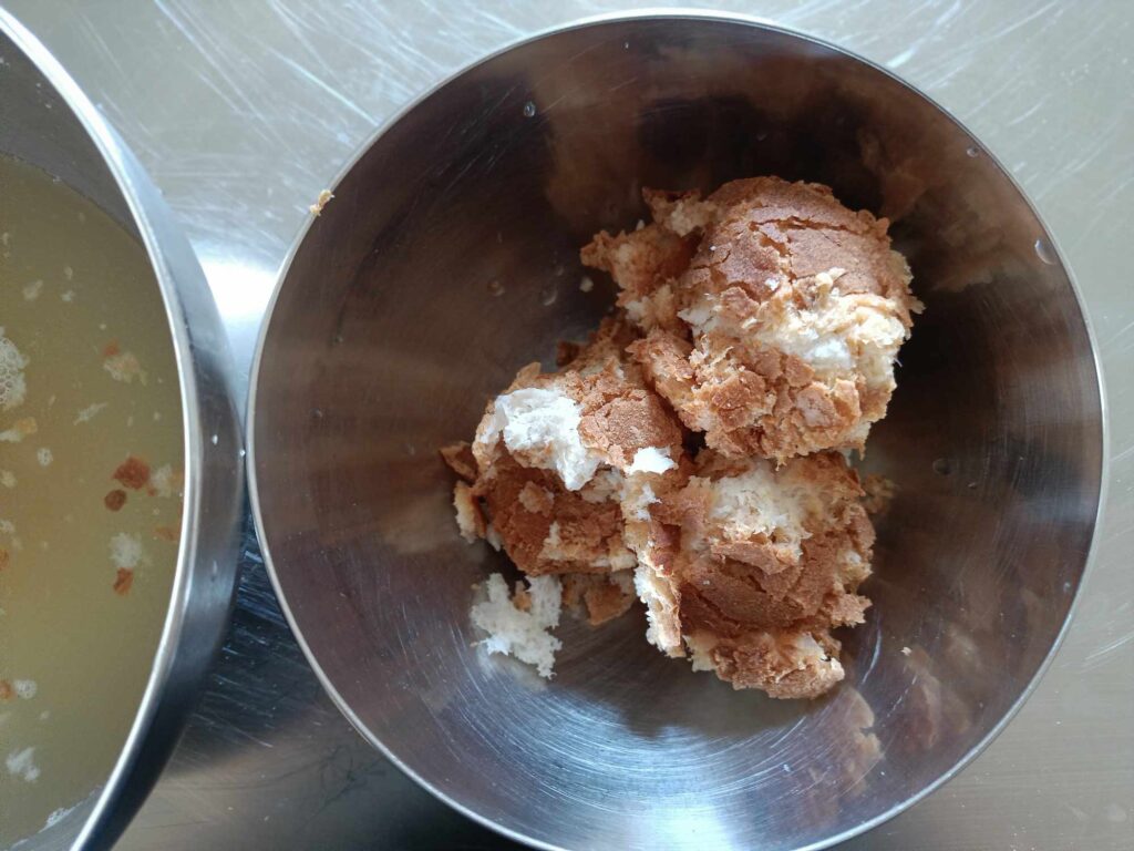 3. Quando il pane risulterà morbido ma non troppo zuppo di acqua,  lo strizzate e lo trasferite in una ciotola.