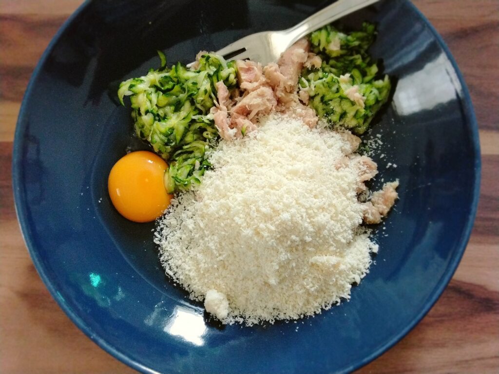 In una ciotola unisci: le zucchine , le uova, il tonno sgocciolato, il formaggio grattugiato, l’aglio tritato ( se gradito ) e il prezzemolo.