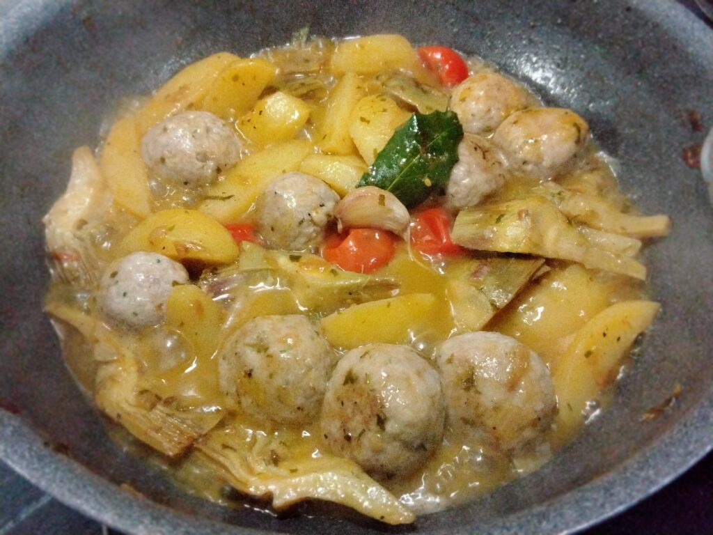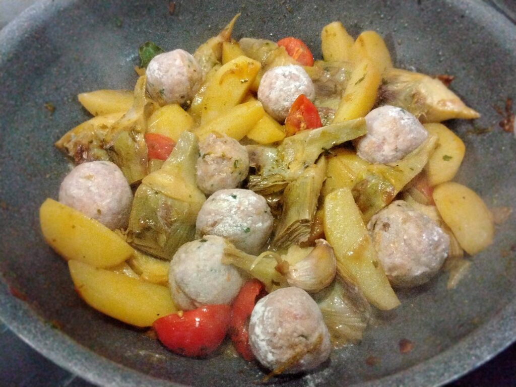 Come già detto la cottura avviene in un’unica padella : basterà soffriggere patate e carciofi, unire le polpette e i pomodori e portare a cottura aggiungendo acqua calda o brodo vegetale.