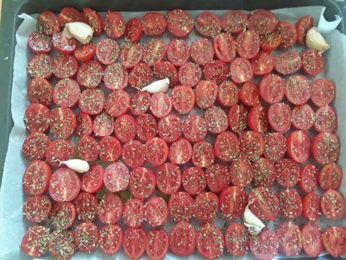4. Cuocete i pomodorini confit in forno caldo a 140° /150° gradi nella parte centrale del forno per circa 2 ore.