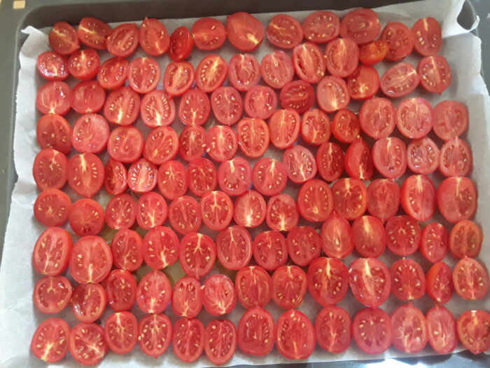 2. Disponete i pomodorini su una teglia da forno ( io ho messo della carta forno, se volete, potete non usarla ) con la parte tagliata verso l’alto.