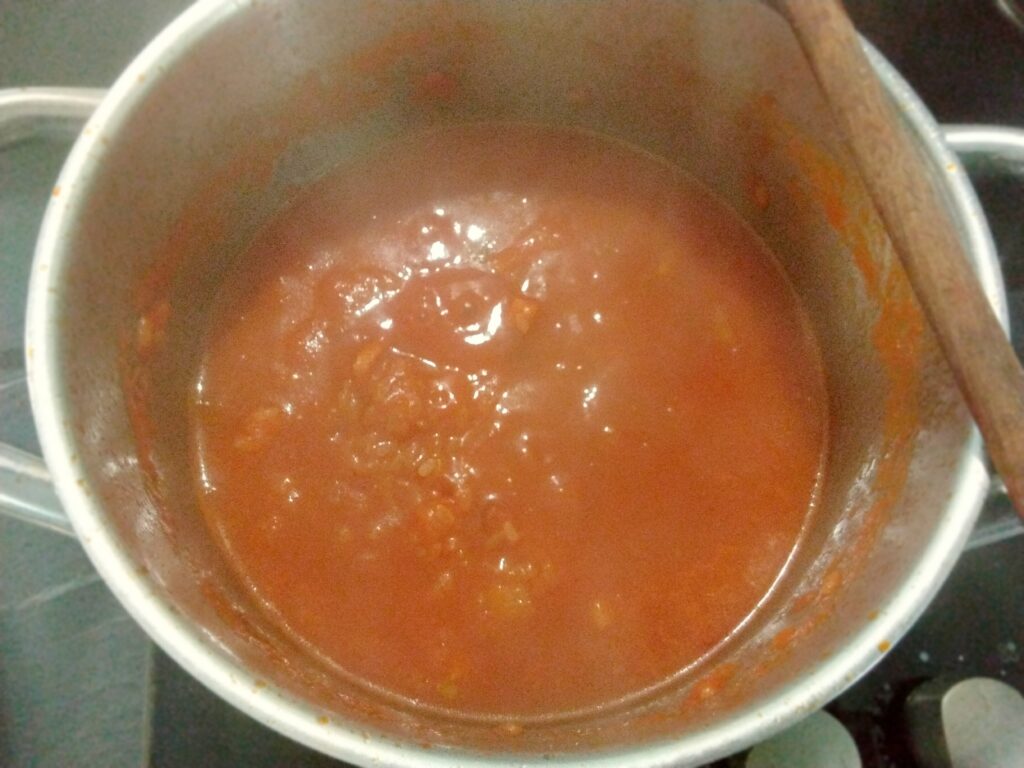 Unisci i pomodori pelati schiacciati o la passata, regola di sale e lascia cuocere per circa 15 minuti.