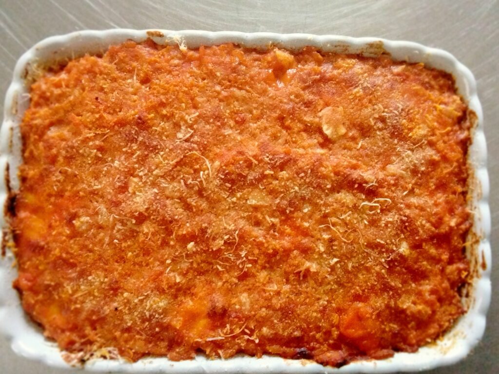 Questa versione al forno trasforma il classico sugo all’amatriciana — a base di guanciale, pomodoro e pecorino romano — in un primo piatto ricco e avvolgente, dove il riso assorbe tutti i profumi e si lega in una consistenza cremosa all’interno , dovuta anche all’aggiunta della scamorza , e leggermente gratinata in superficie.