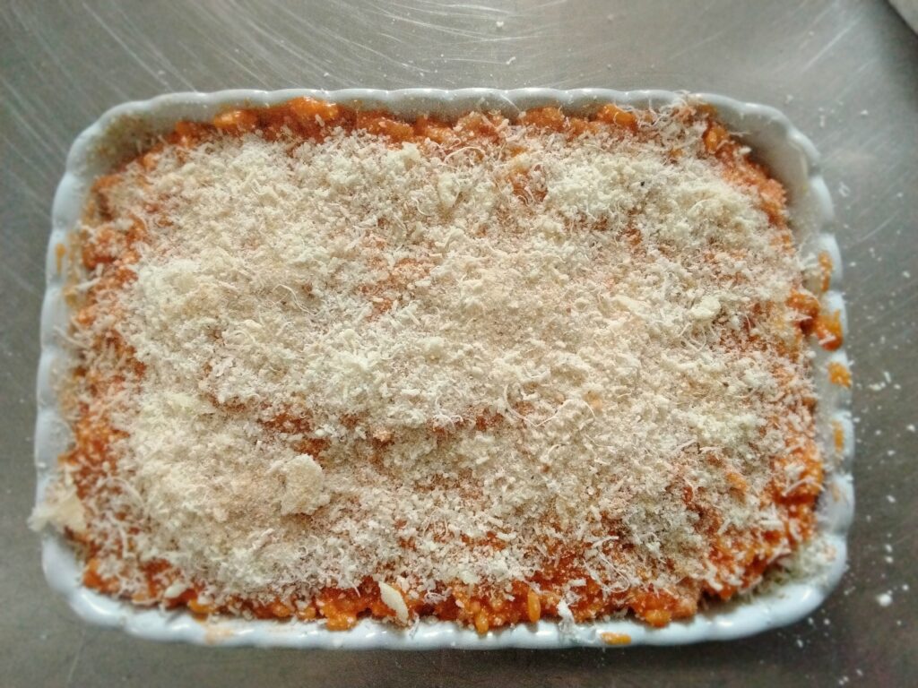 Aggiungi il riso rimasto e livella la superficie. Completa con una spolverata di pecorino e , se gradito, pangrattato.