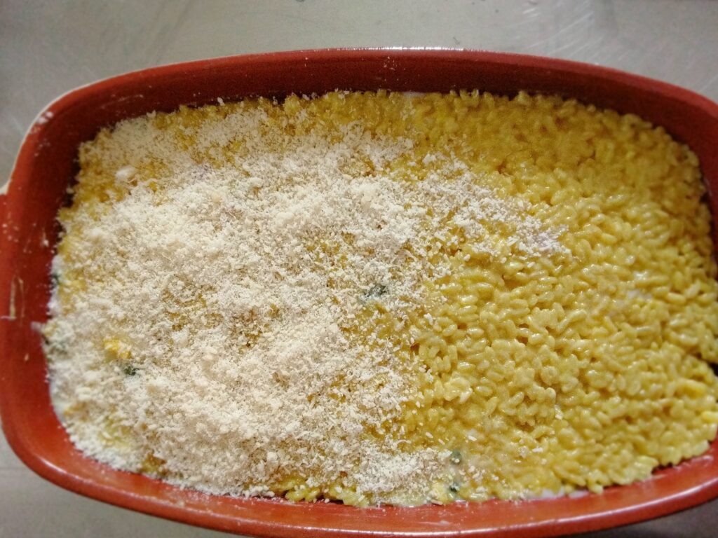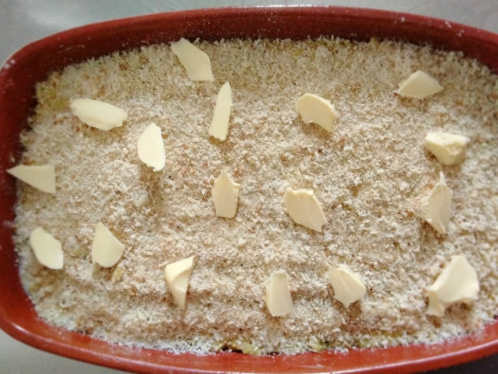 Spolvera con pangrattato e parmigiano, aggiungendo qualche fiocchetto di burro in superficie.