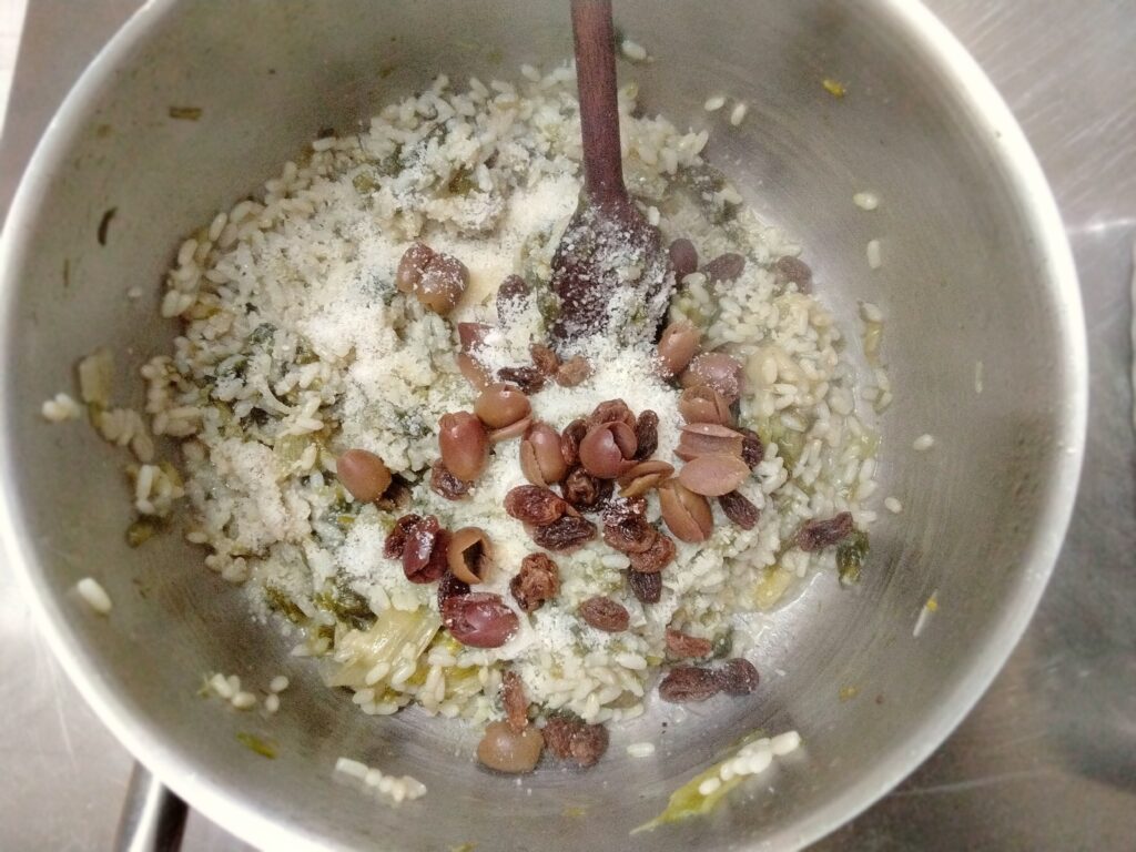 A cottura ultimata, a fuoco spento: incorpora il parmigiano grattugiato , aggiungi olive, uvetta (ammollata) e pinoli.