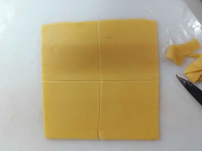 7. Stendete la pasta frolla e ricavate dei quadrati da 10 x 10 cm.