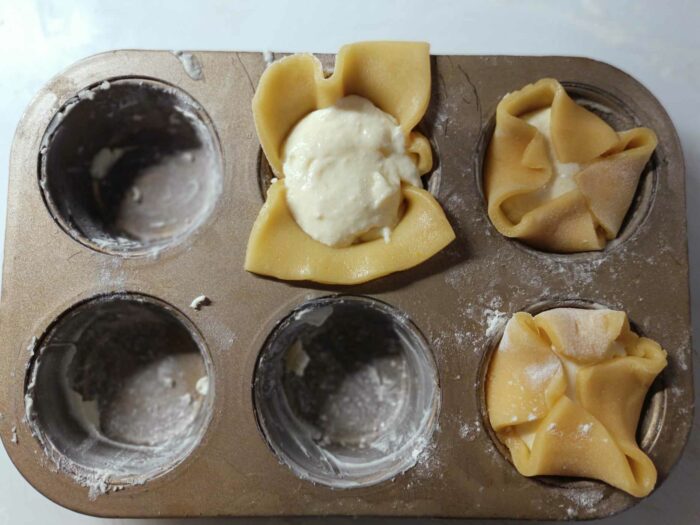 Dopo aver preparato la pasta frolla, che in questo caso non necessita di riposo, andremo a ricavare dei pezzi di pasta frolla quadrati che , inseriti in pirottini di stagnola o nello stampo da muffin, saranno farciti con un ripieno di ricotta , zucchero e uova .