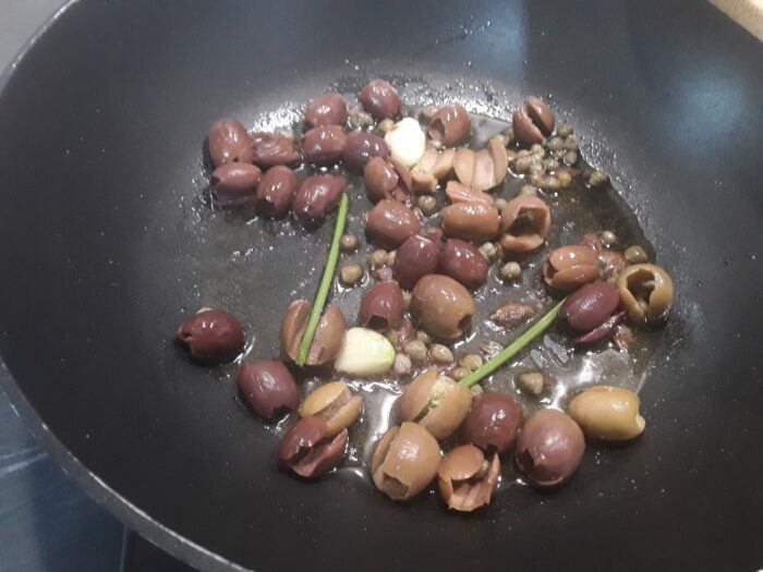 2. Dissalate i capperi e denocciolate le olive , eliminate l’aglio e il peperoncino ed unite al soffritto le olive denocciolate,